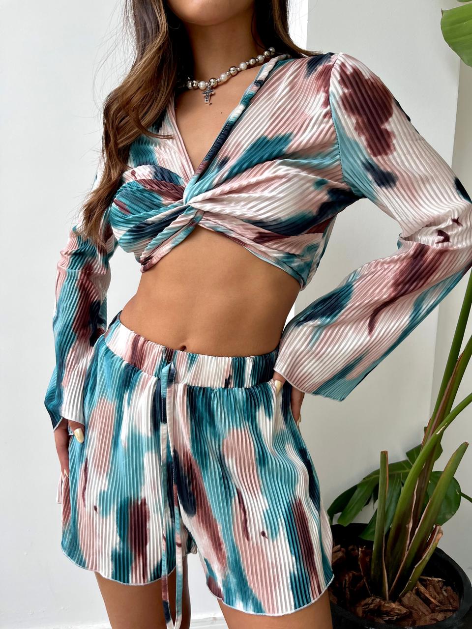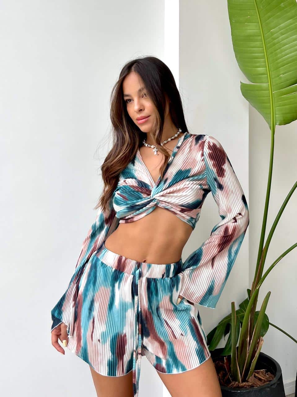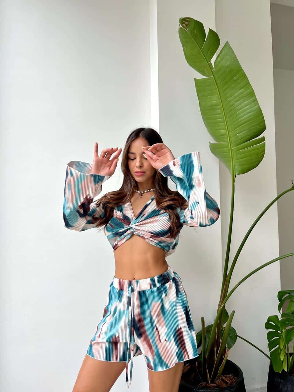 Conjunto de dos piezas, top con nudo y manga abullonada. Tela 100% poliester tricotada.