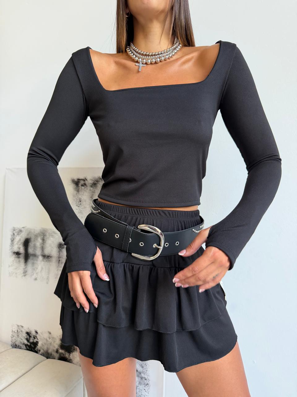Remera manga larga con escote cuadrado. Talle único (S al L aproximadamente).
