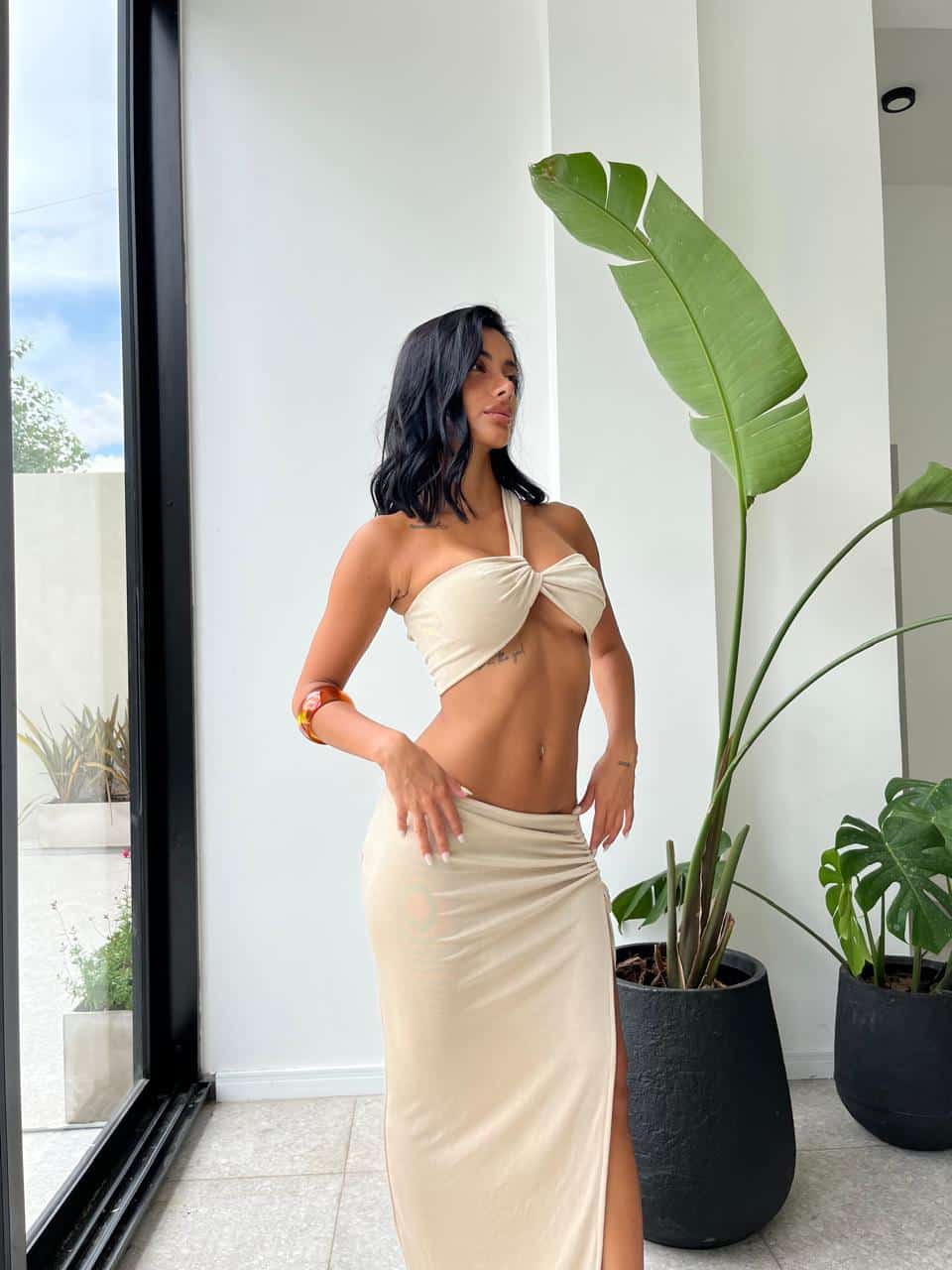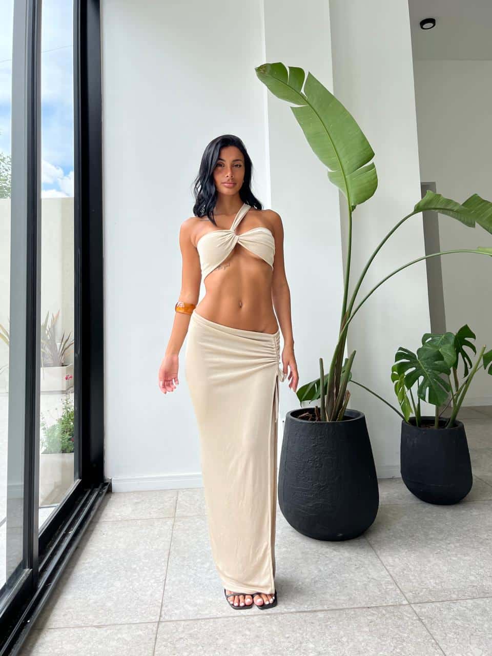 Top y falda de tela tipo acetato. Talle único (S al L).