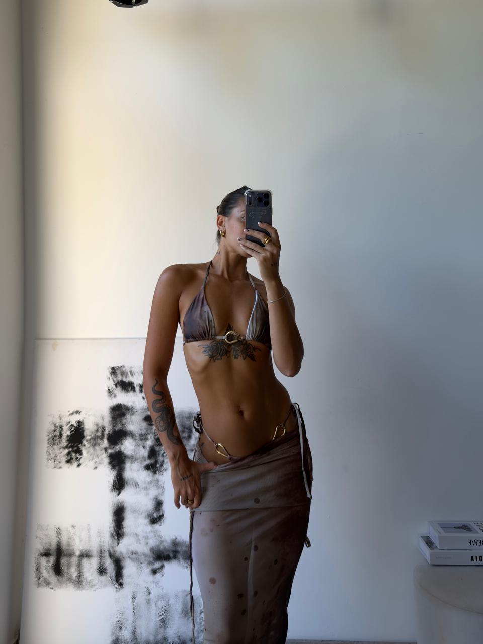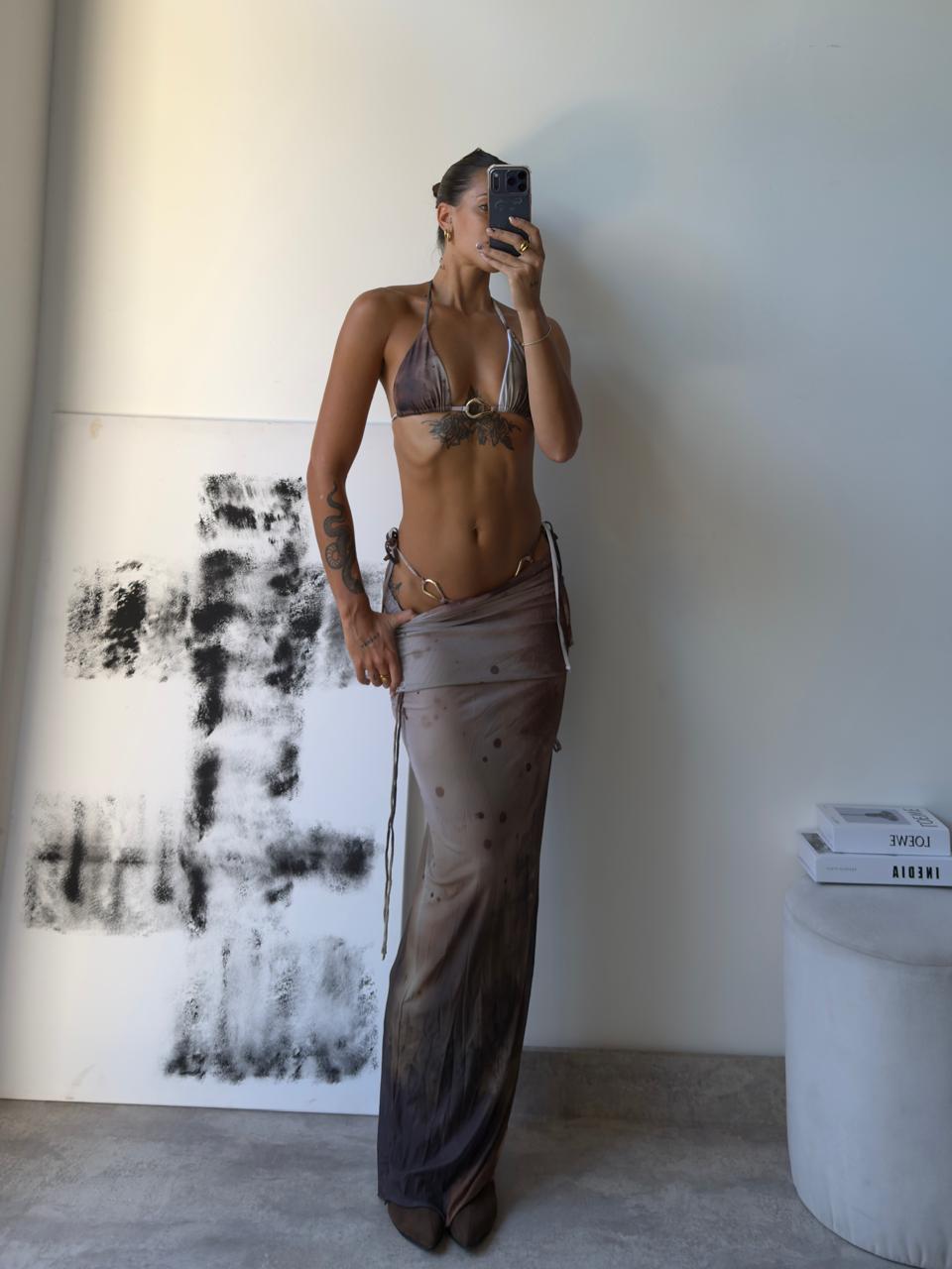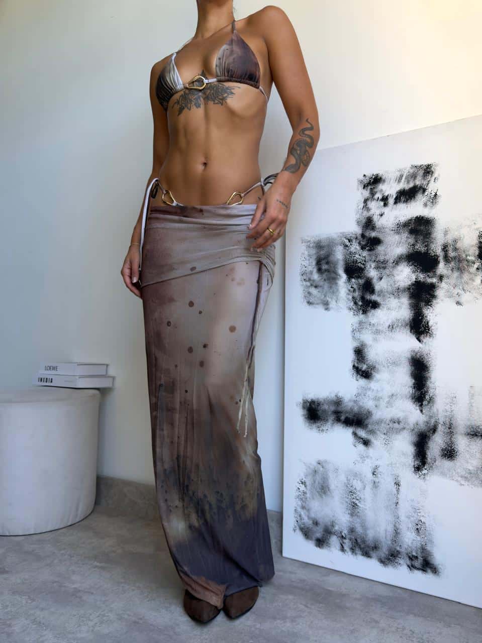 Set de bikini con avio y pollera de tul. Talle unico (S al L aproximadamente).