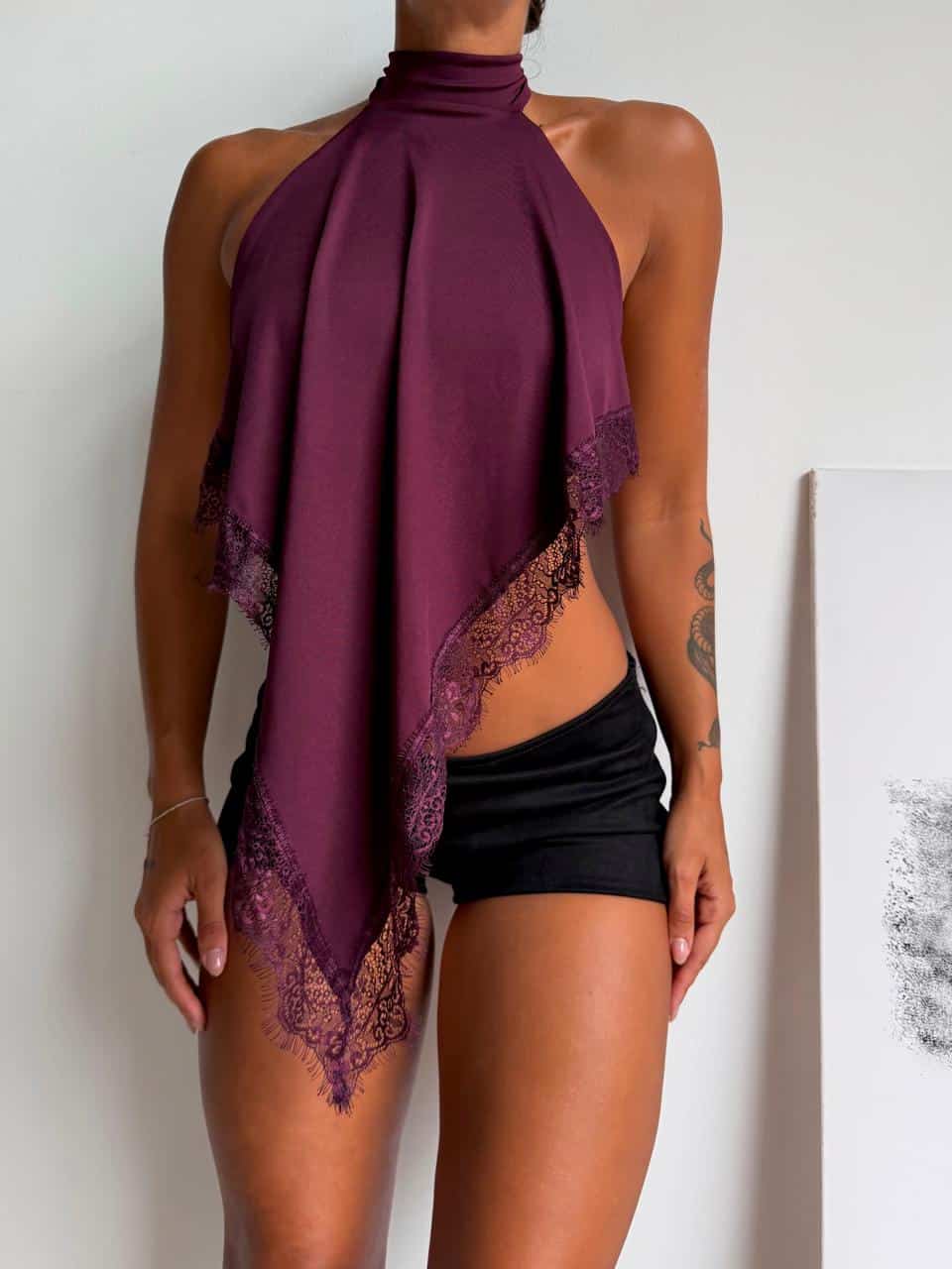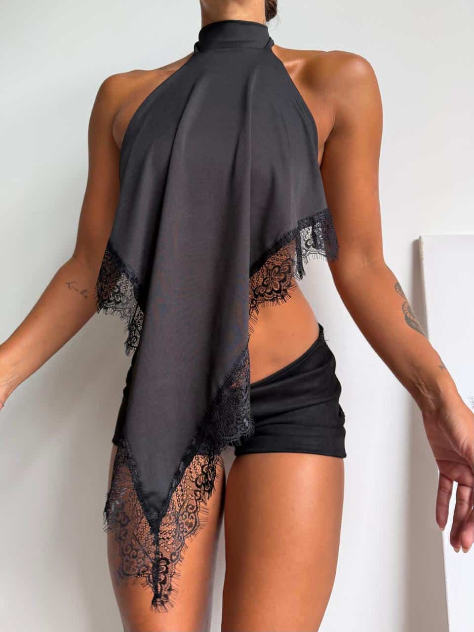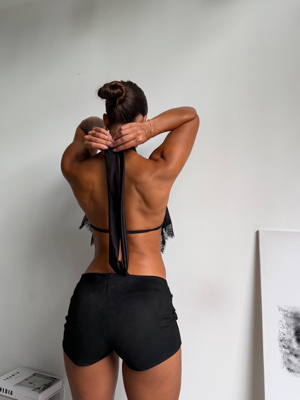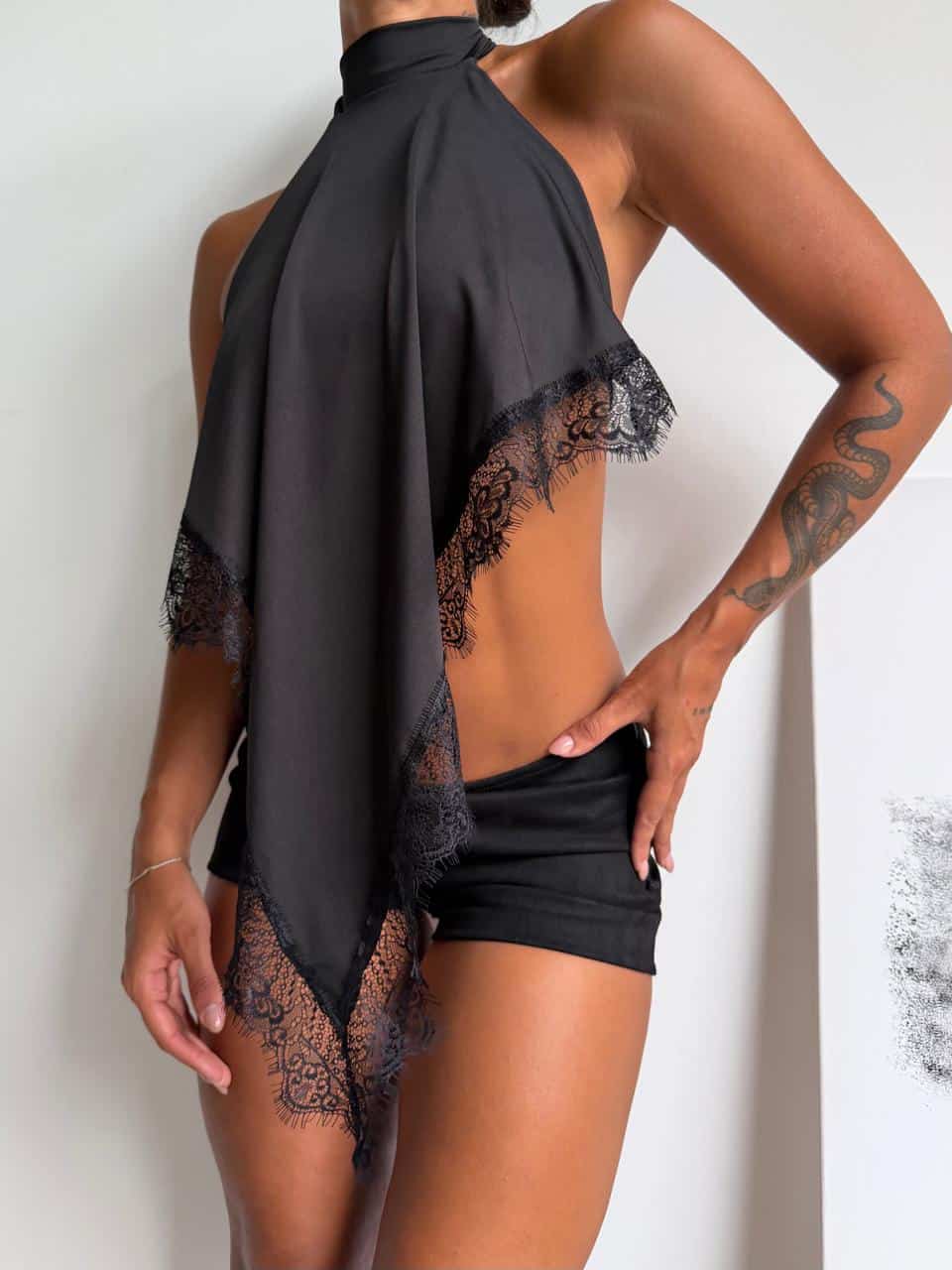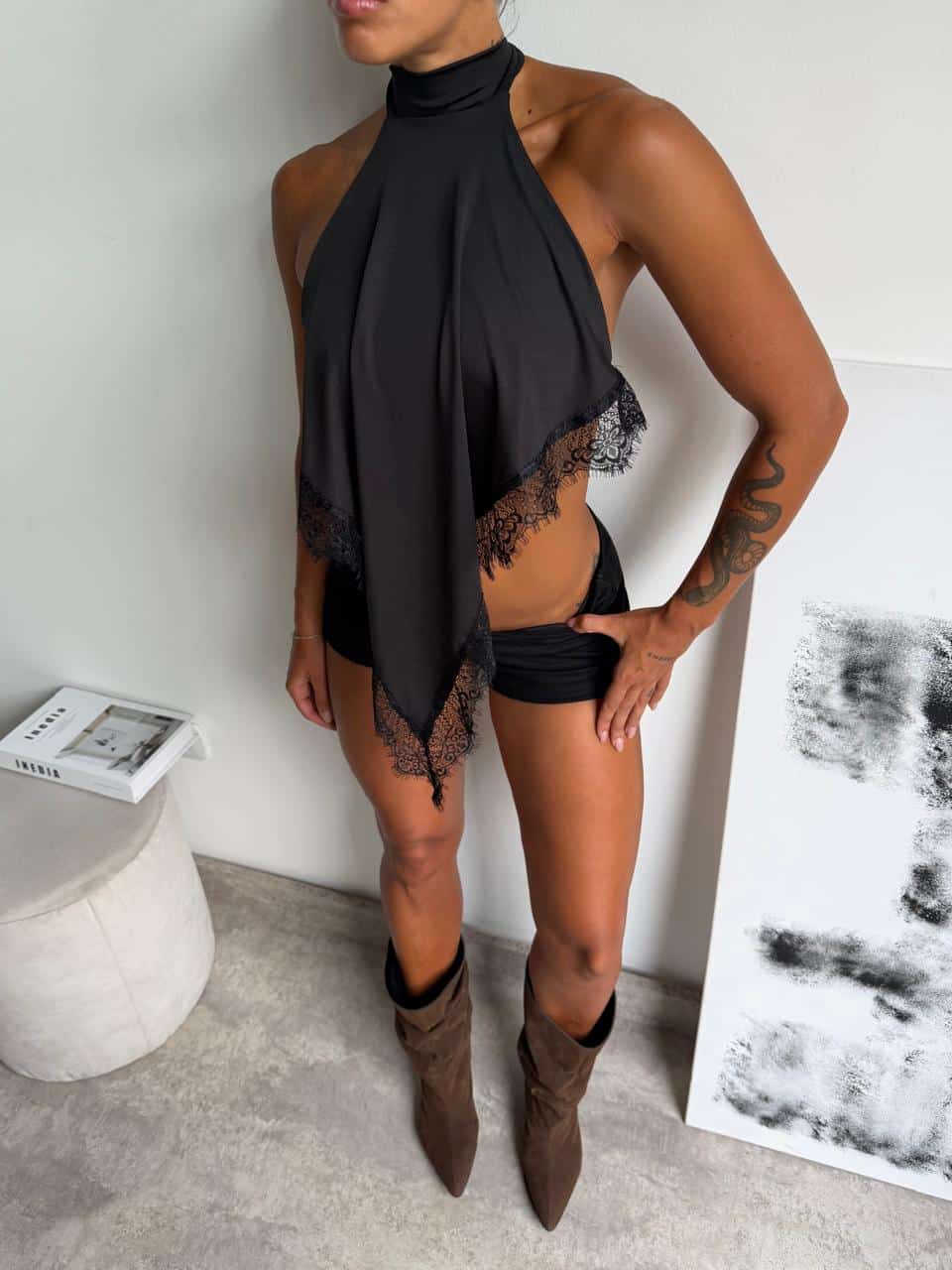 Top choker pico con espalda descubierta y puntilla. Talle unico (S al L aproximadamente).