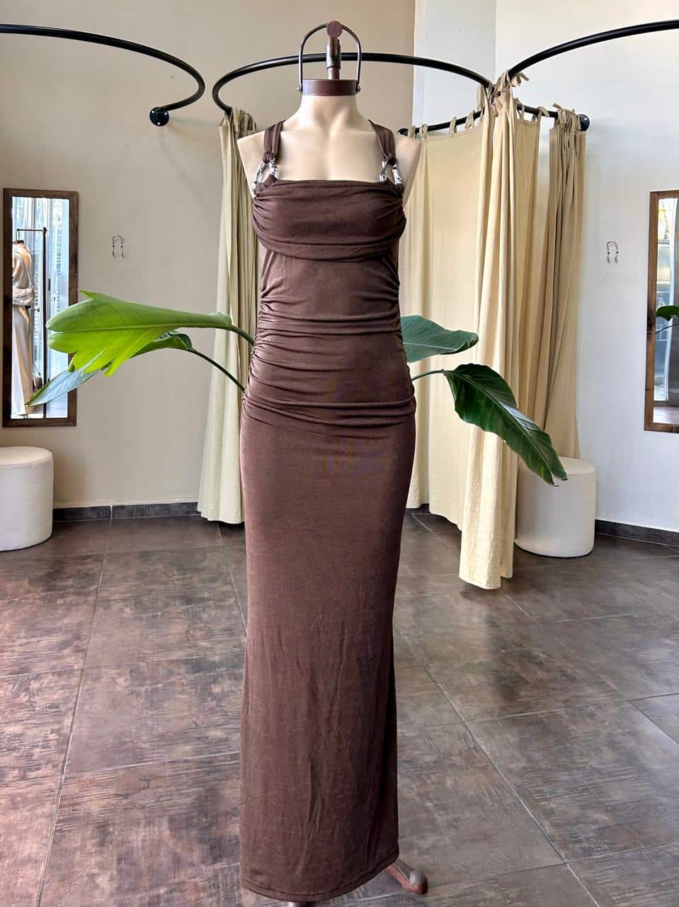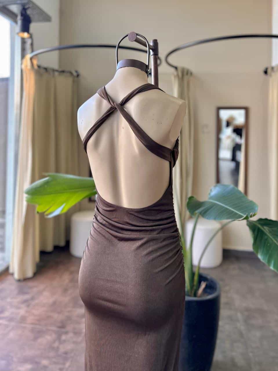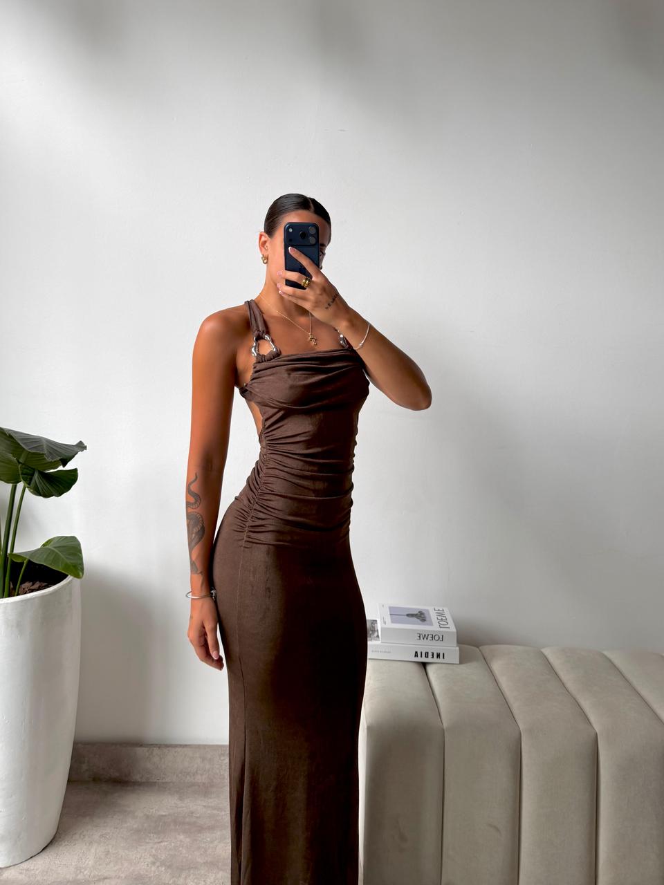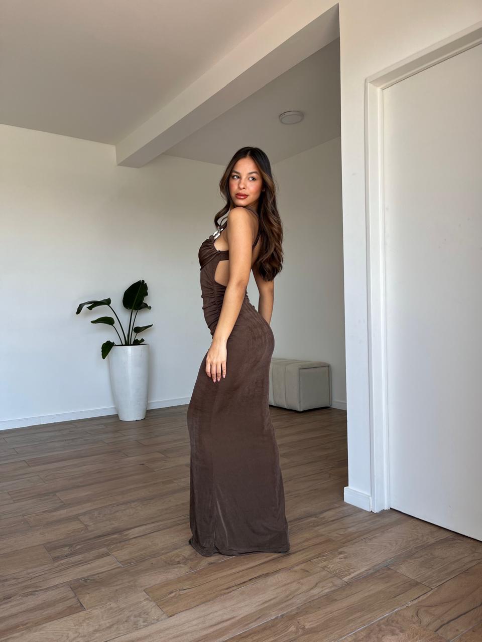 Vestido de tela tricotada, forrado con cueo asimetrico y detalle de avio. Talle unico, S al L aproxiamdamente.