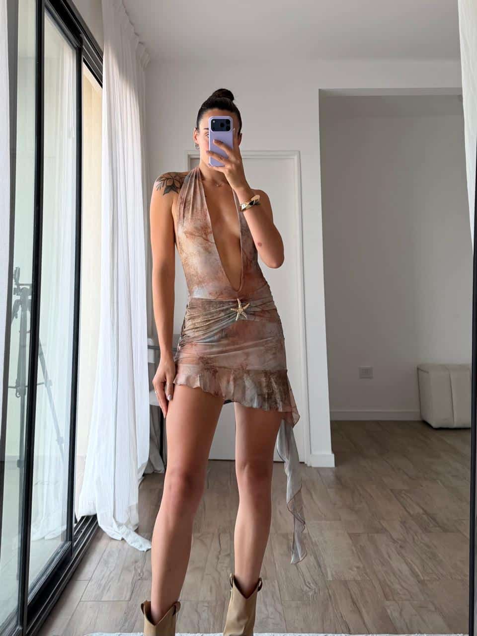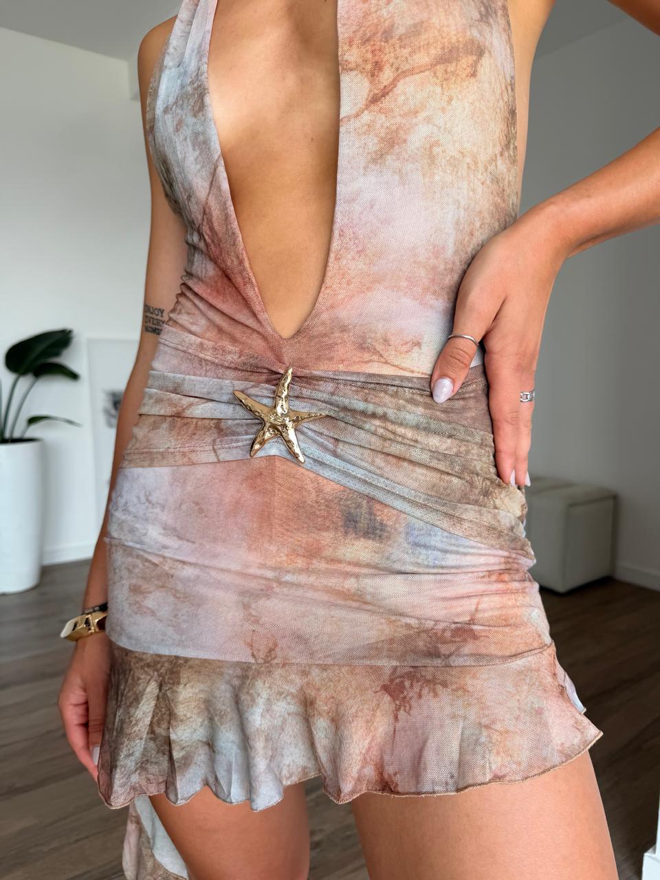 Vestido corto con estampado y escote con detalle, espalda descubierta. (Talle único S al L).