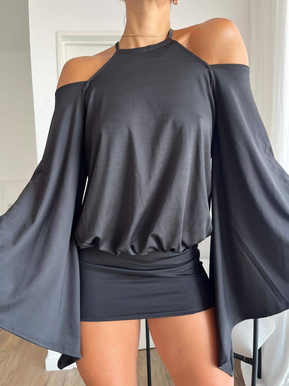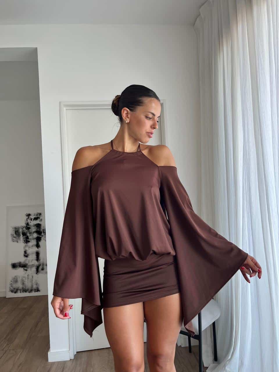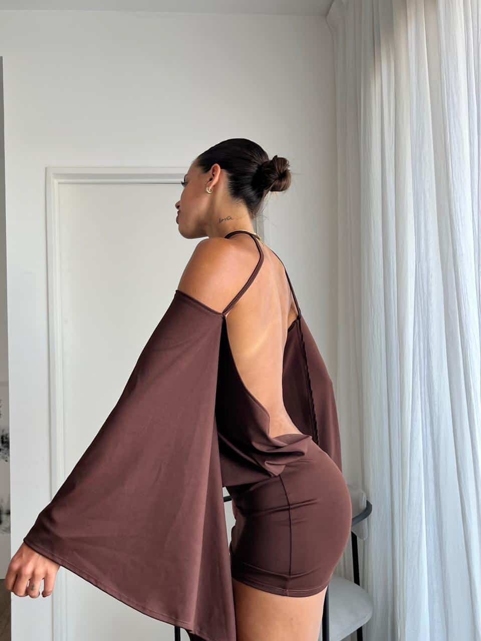 Vestido con manga ancha y espalda descubierta de microfibra. Talle único (S al L aproximadamente).