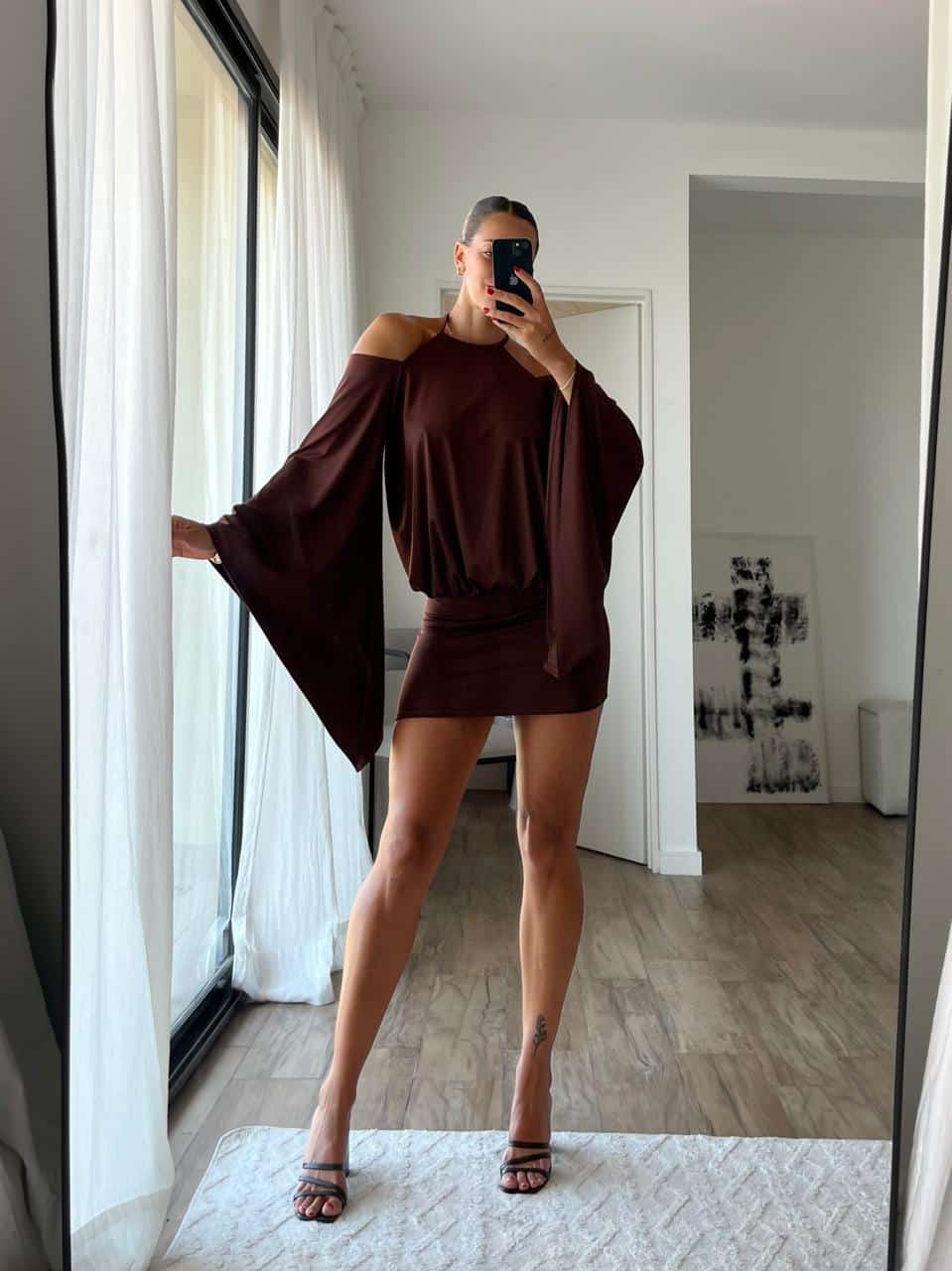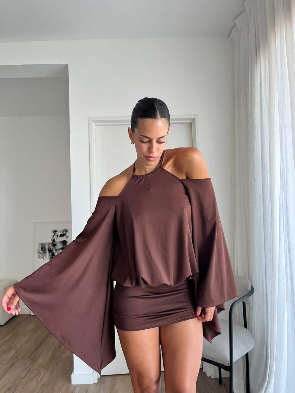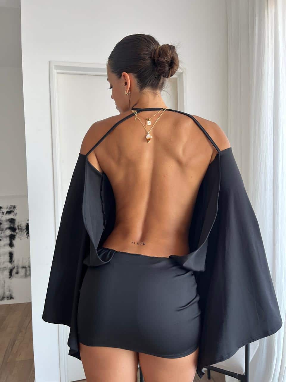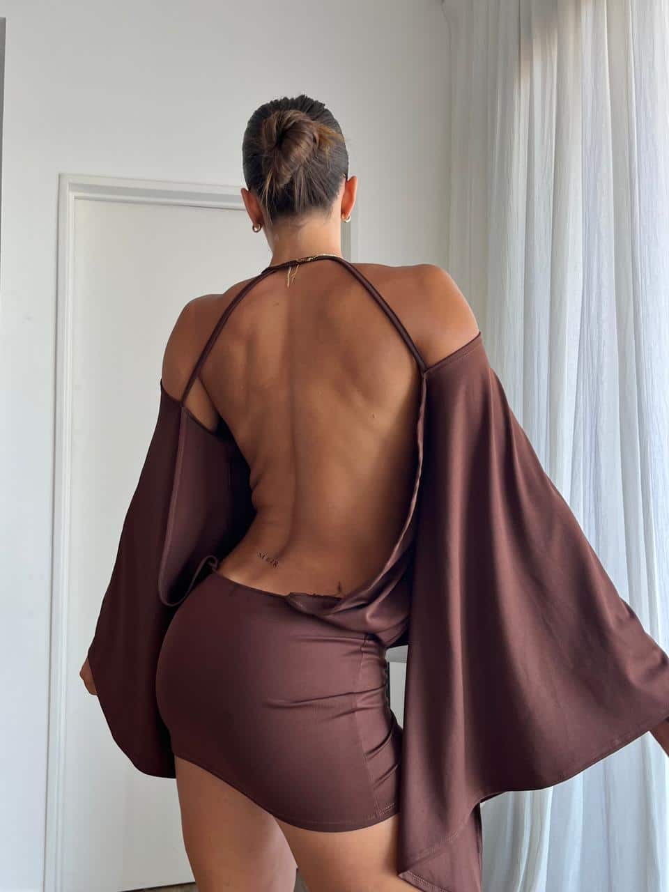 Vestido con manga ancha y espalda descubierta de microfibra. Talle único (S al L aproximadamente).
