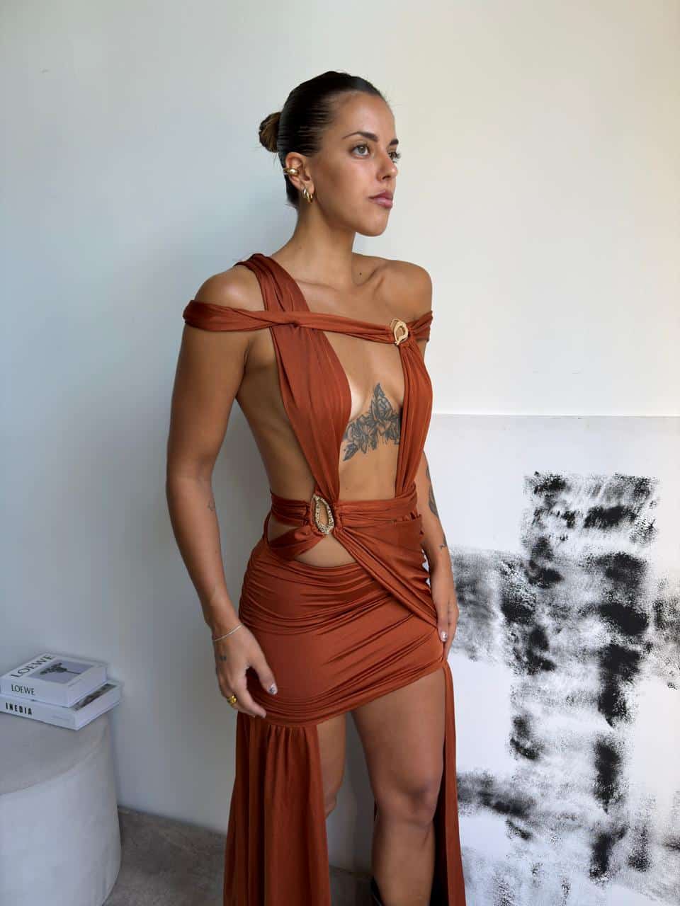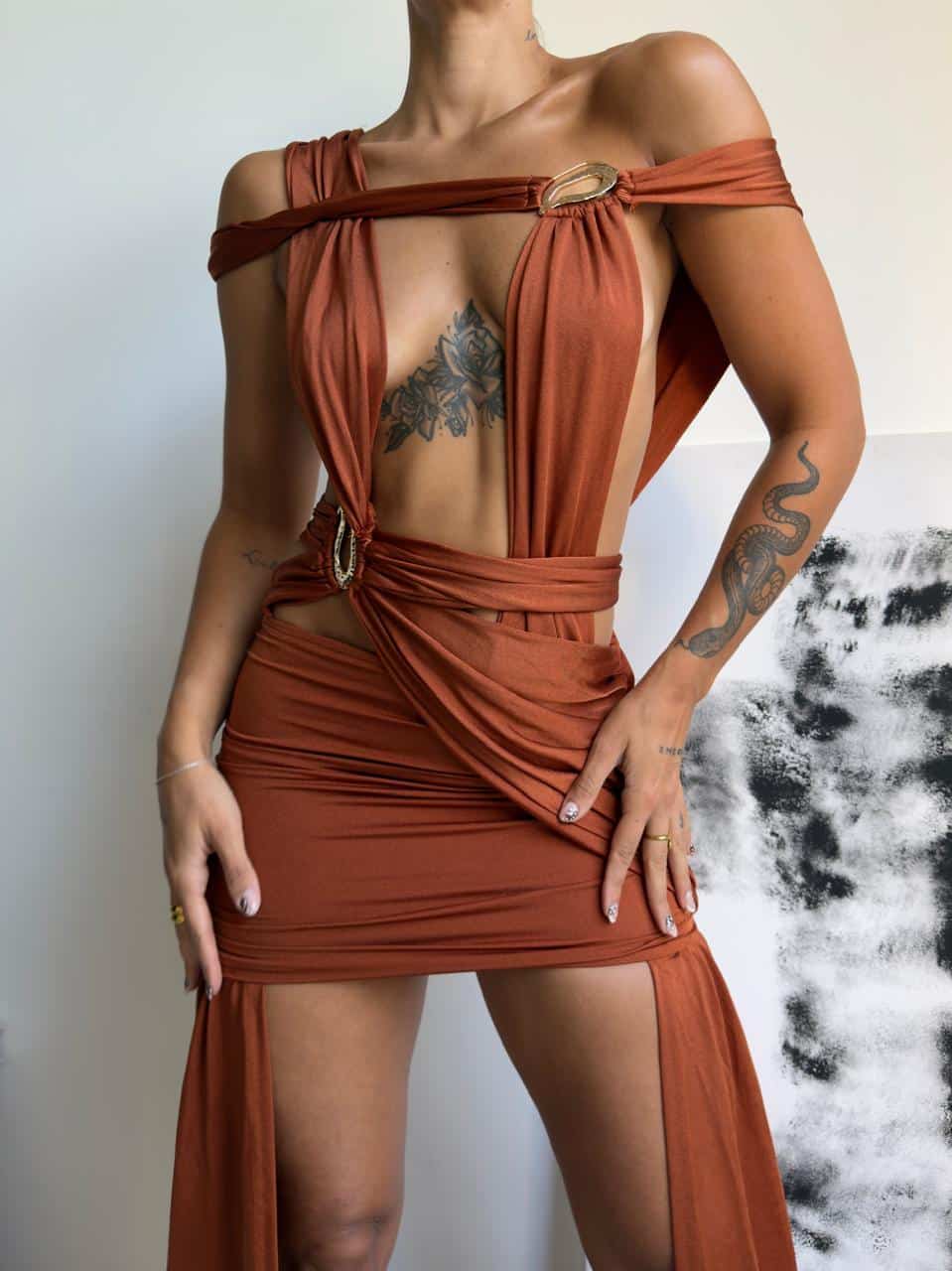Vestido con corte cruzado y aberturas. Talle unico (S al L aproximadamente).