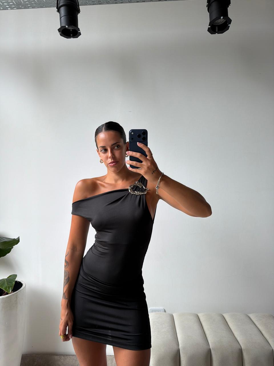 Vestido a un hombro con aplique. Talle único (S al L aproximadamente).