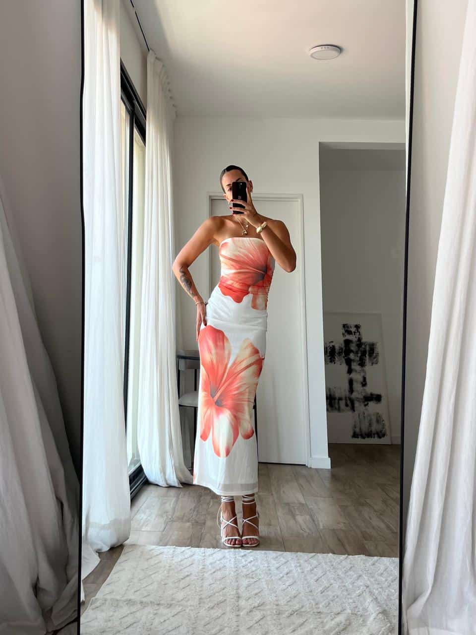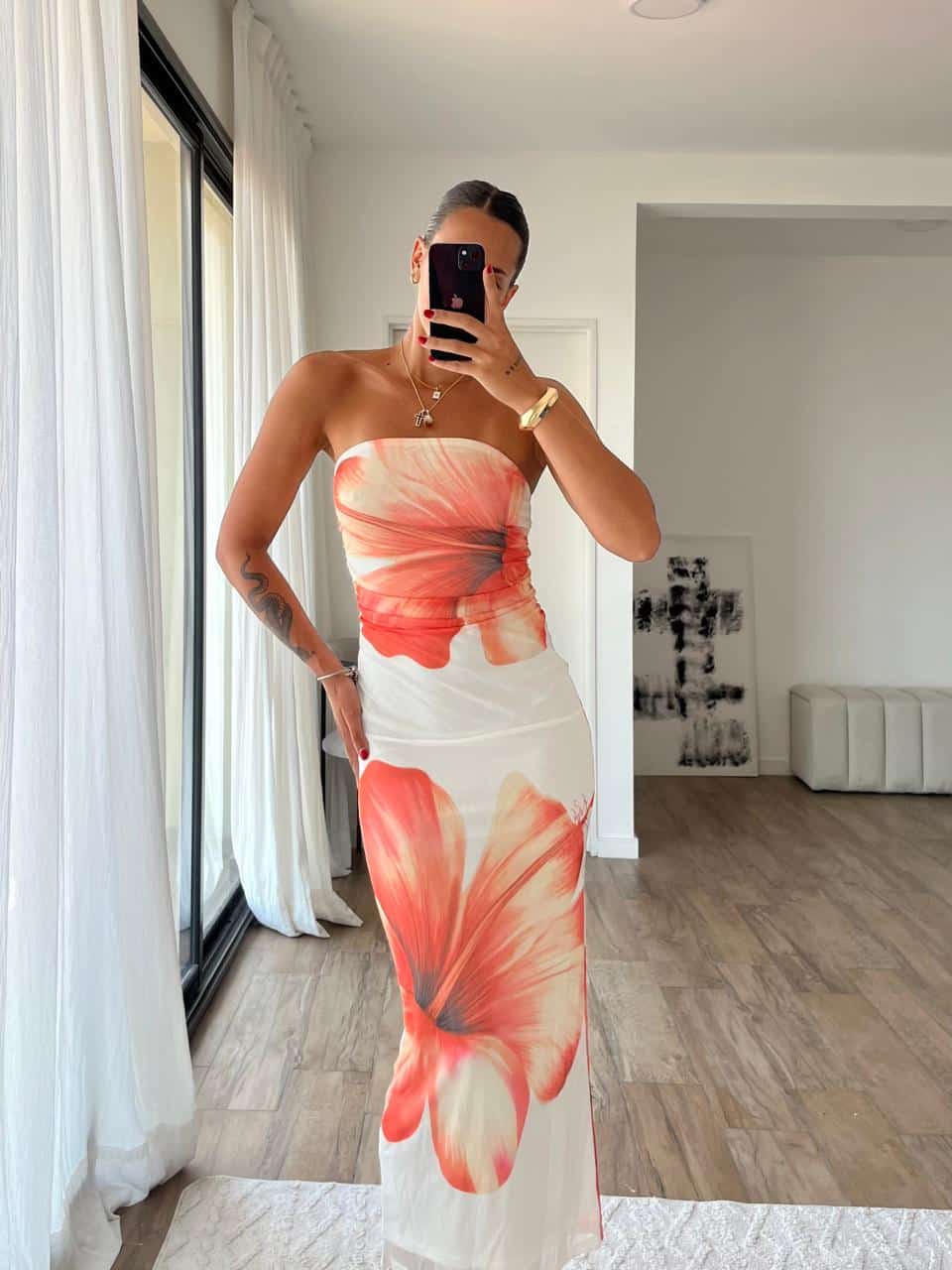 Vestido strapless ajustado estampado de tela eastica. Talle unico, S al L aproximadamente.