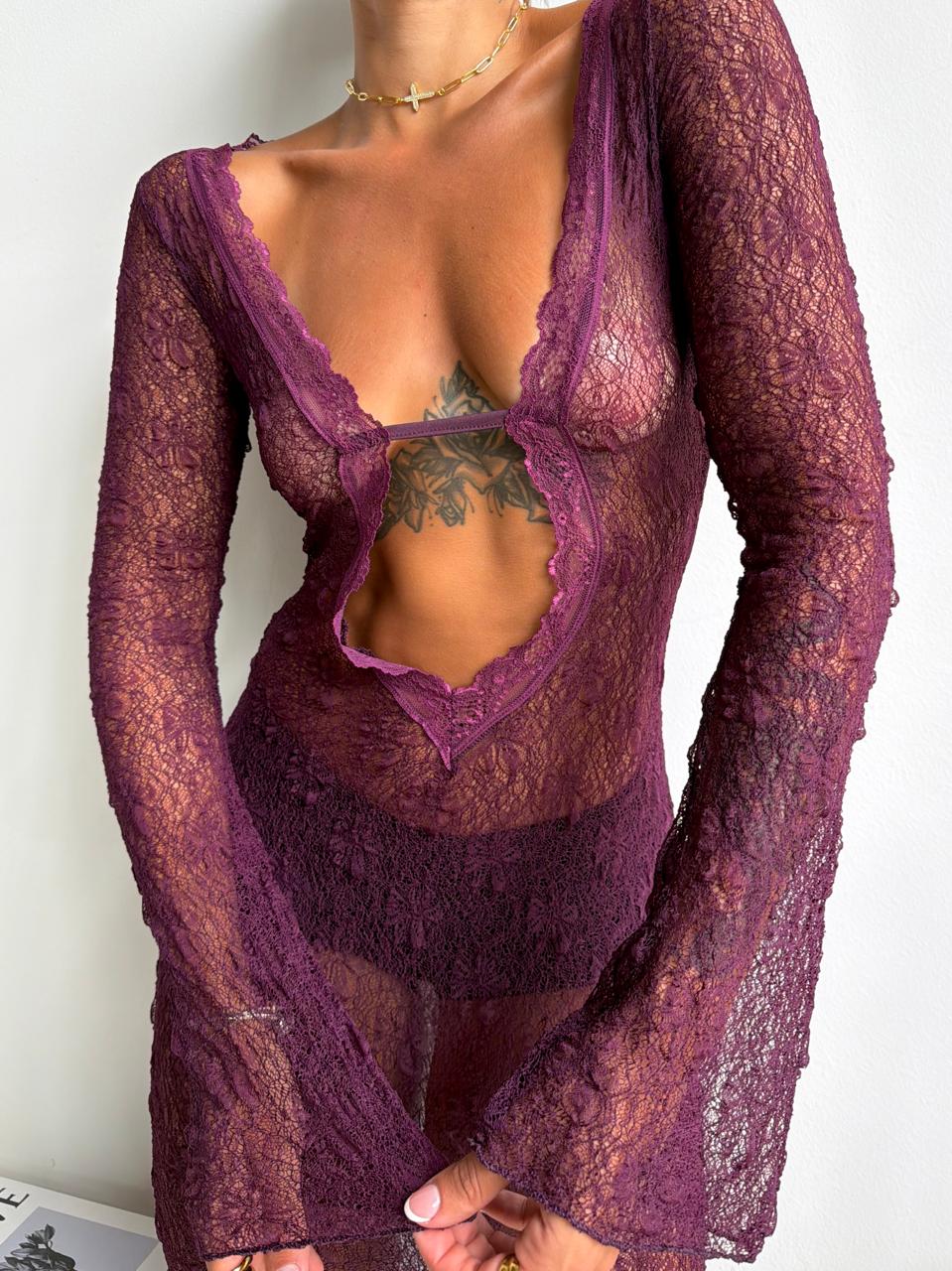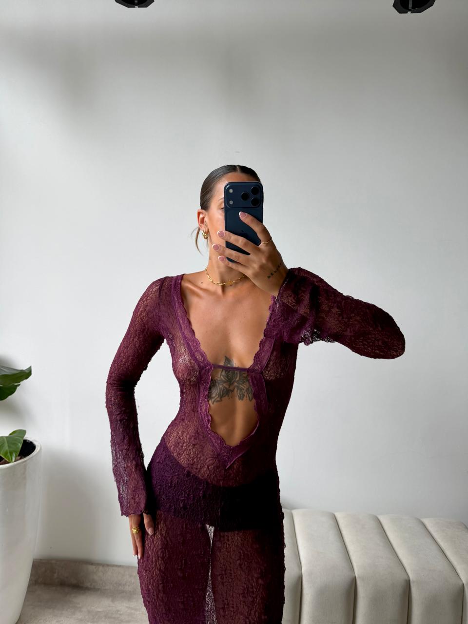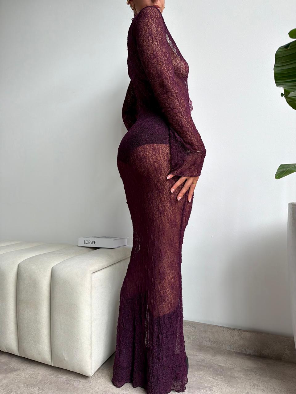 Vestido largo escote en V de puntilla. Talle único (S al L aproximadamente).