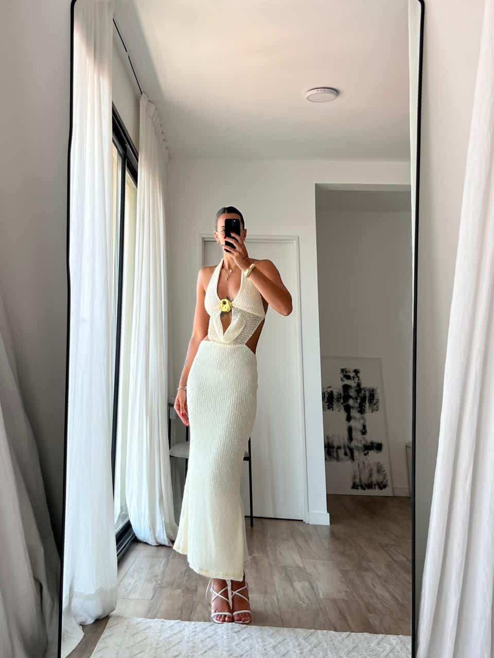 Vestido largo con escote en V profundo con avio en el busto. Talle único (S al L aproximadamente).