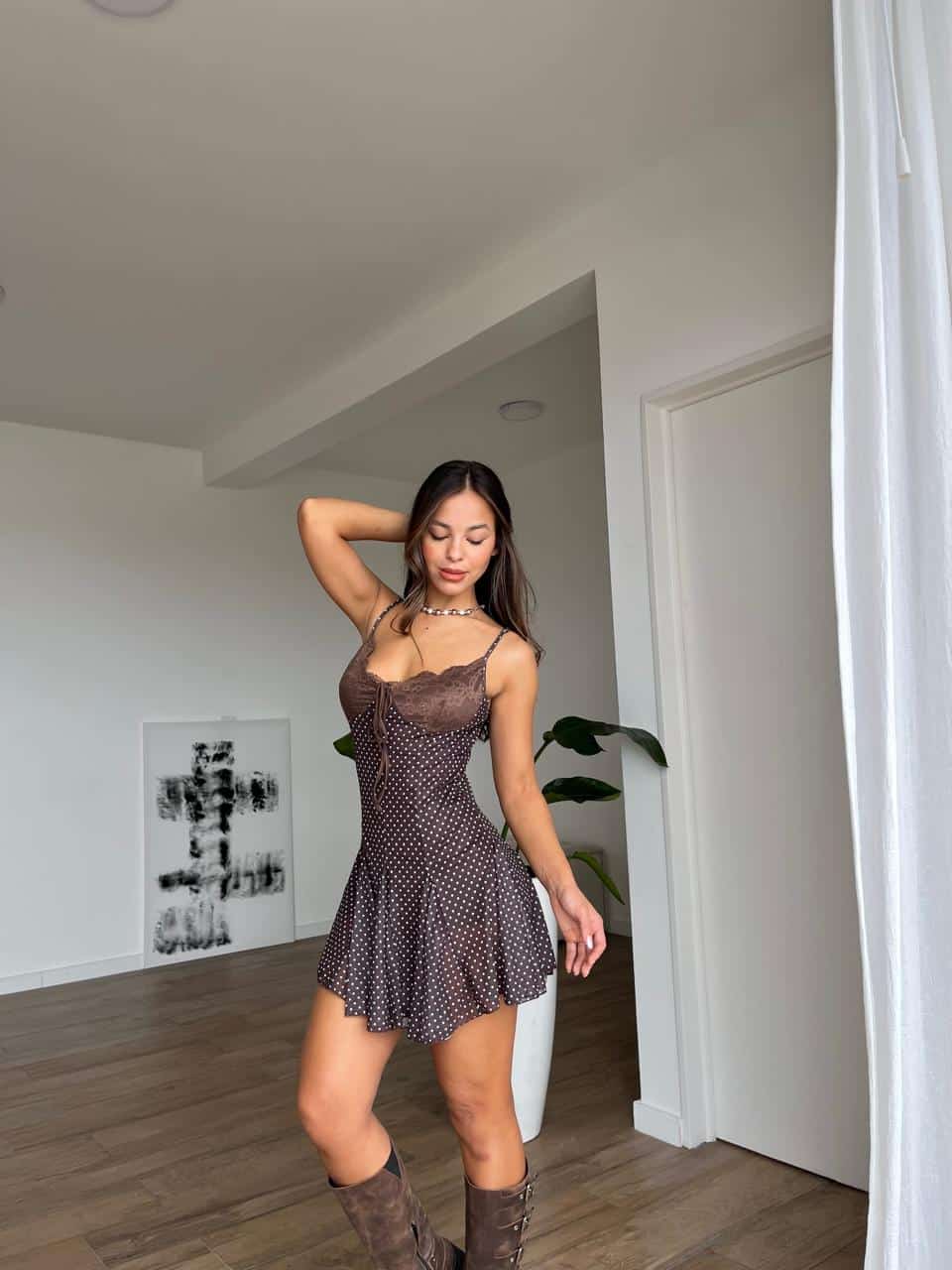Vestido corto casual con tirantes finos y estampado de lunares. Talle unico, S al L aproximadamente.