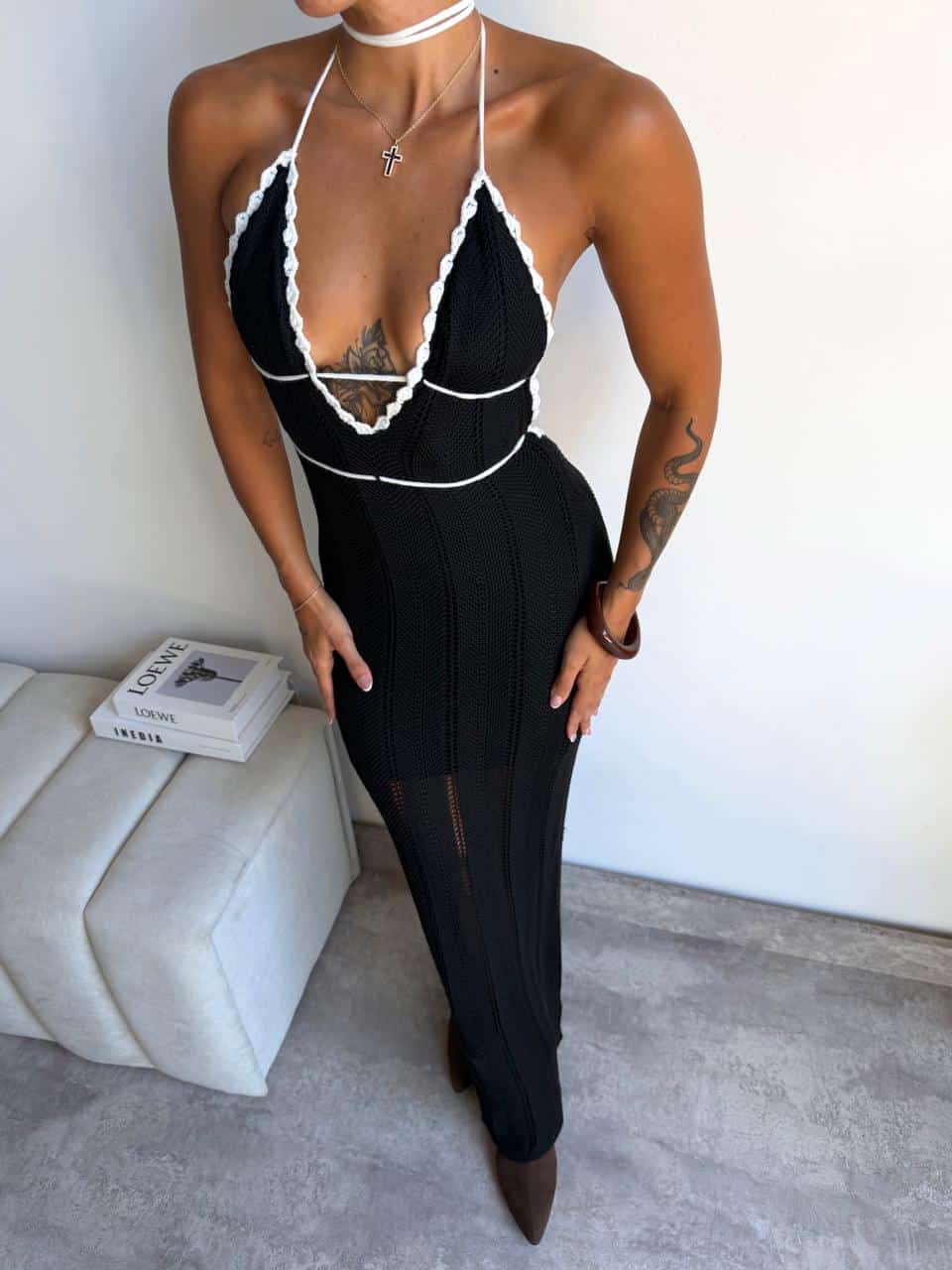 Vestido de punto con cuello colgante y espalda descubierta, estilo bohemio / elegante. Talle unico, S al L aproximadamente.