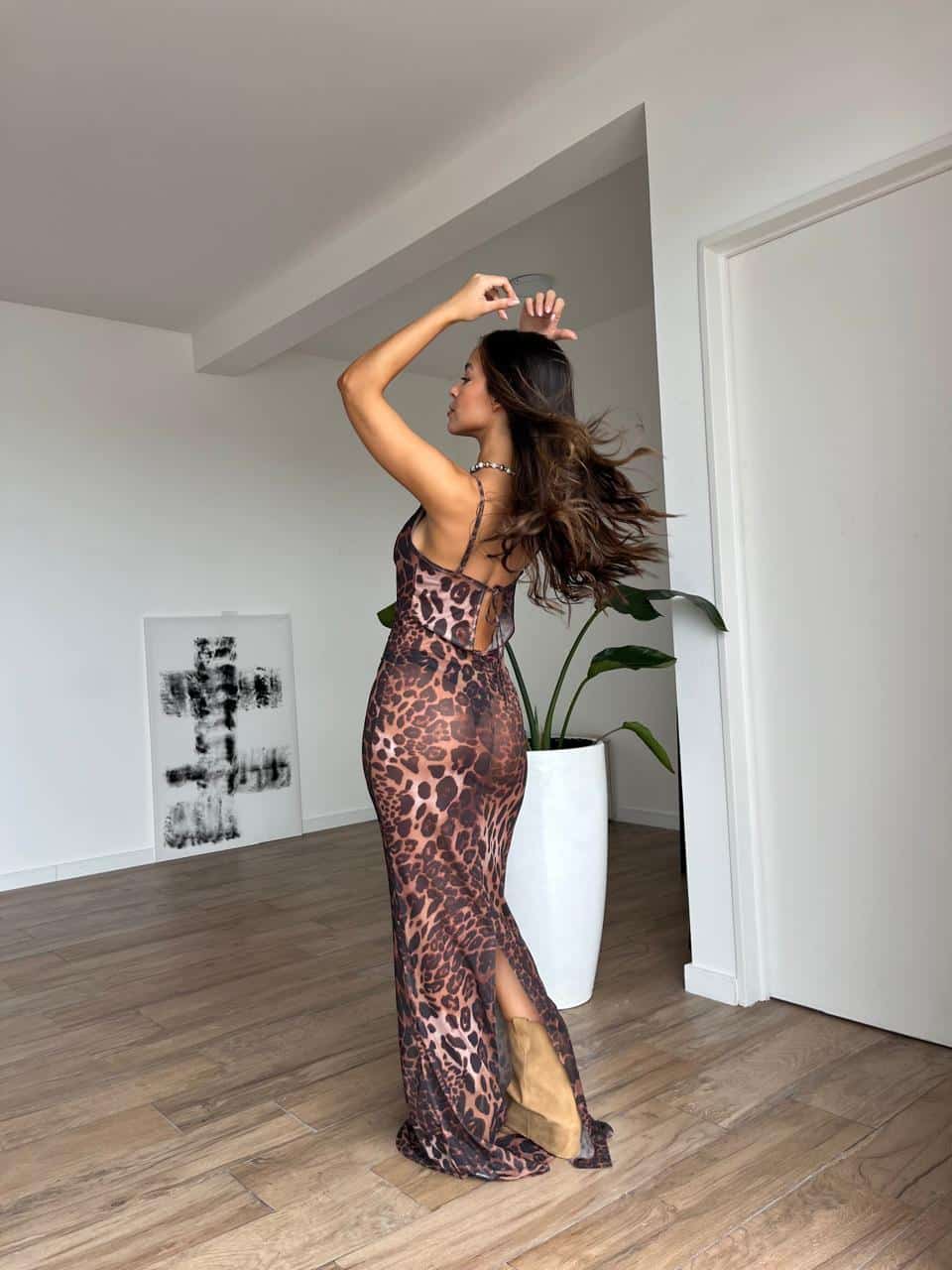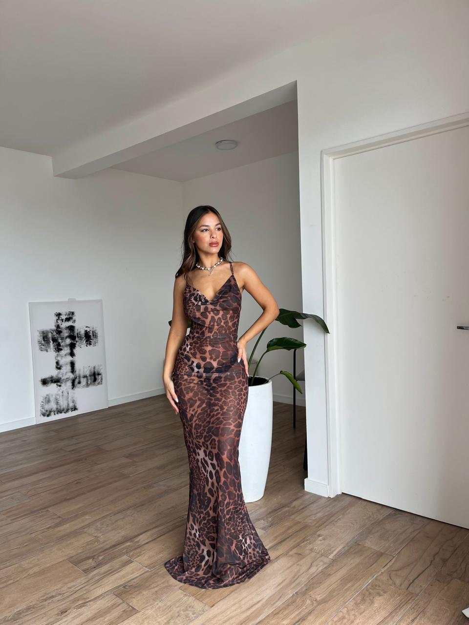 Vestido animal print de tela tricotada semitransparente. Talle unico (S al L).